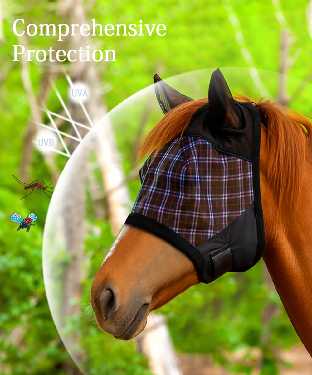 Keep irritating flies at bay with the Trianglewin's Fly Mask. Made from breathable black mesh for improved visibility with a distinctive hexagon pattern, this mask ensures a clear, unobstructed view without compromising on comfort. It also provides 70% overall UV protection.